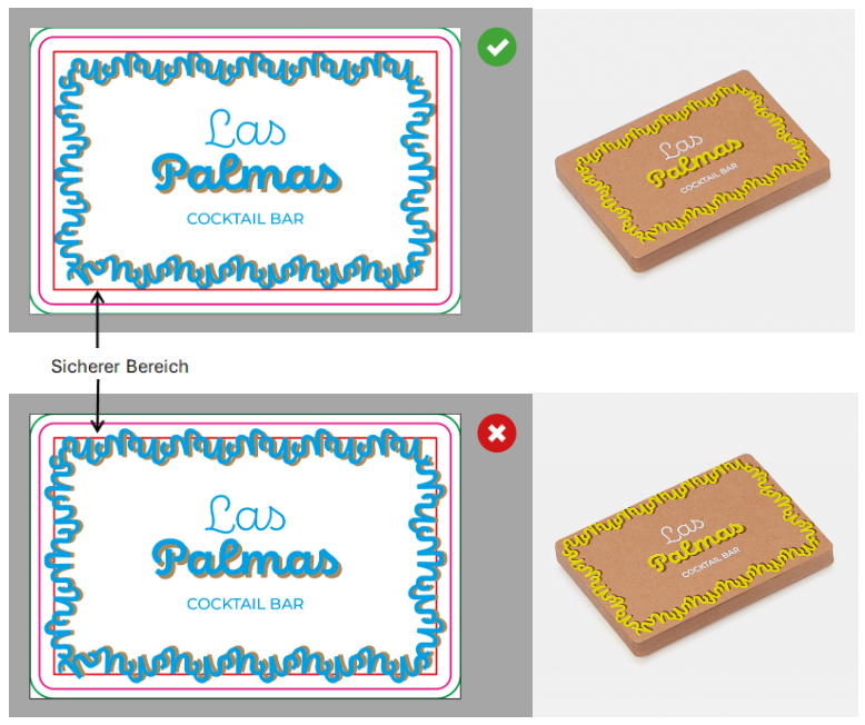 Wenn Ihre Datei einen Rahmen enthält, platzieren Sie ihn innerhalb des sicheren Bereichs (mindestens 3 mm von der Schnittlinie entfernt), und Sie können sicher sein, ein gutes Ergebnis zu erzielen!