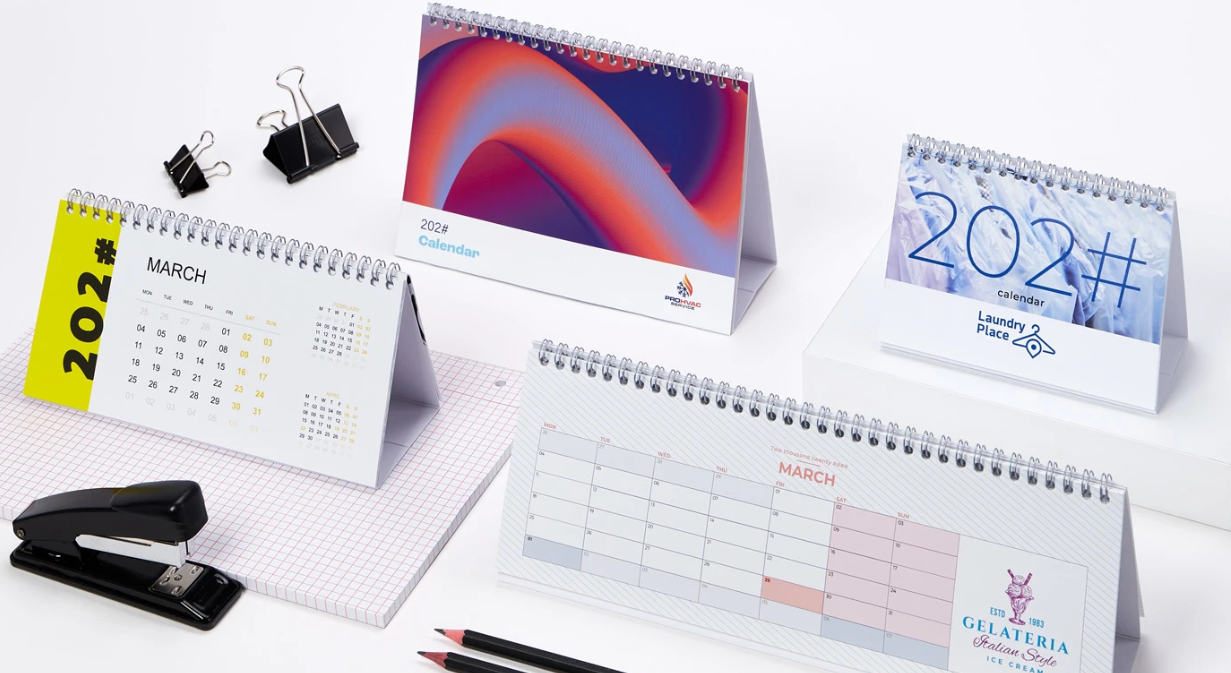 Der beste Gegenstand, auf Ihrem Schreibtisch! Mit einem Tischkalender auf Ihrem Schreibtisch oder Ihrer Arbeitsplatte können sich Ihre Kunden leichter an ihre Termine erinnern und sich gleichzeitig Ihr Logo oder Ihr Firmenmotto einprägen! Diese 28-seitigen Kalender sind in 5 verschiedenen Formaten erhältlich und bieten Ihnen die Möglichkeit, jeden Monat des Jahres ganz individuell zu gestalten. Wenn Sie Ihre Grafiken schneller erstellen möchten, können Sie eines unserer teilweise bearbeitbaren Layouts wählen, in das Sie auf der einen Seite das Datum und auf der anderen Seite Ihre Fotos einfügen können, so dass, wenn der Kalender auf dem Tisch liegt, auf der einen Seite der Monat und auf der anderen Seite das von Ihnen gewählte Bild zu sehen ist. |