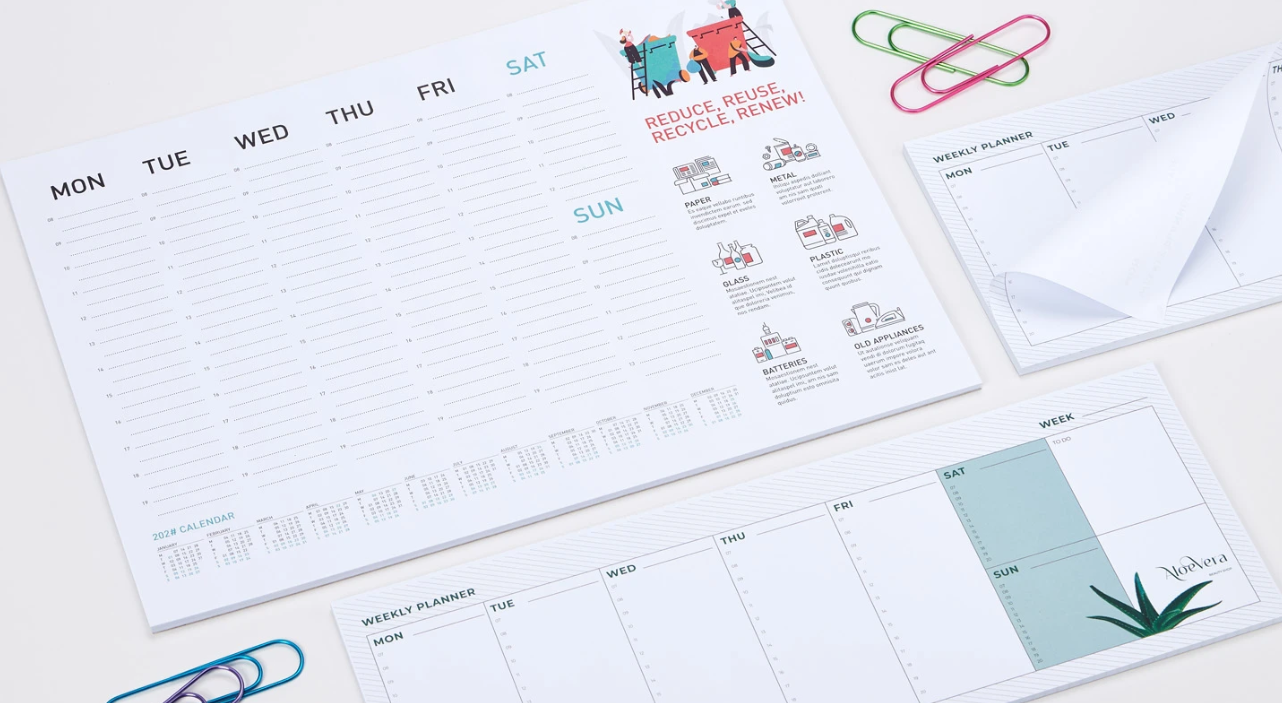 Ein Jahresplaner hilft Ihnen, Ihre Zeit besser zu organisieren und Ihre Produktivität zu steigern, egal ob im privaten Bereich, bei der Arbeit oder im Studium! Wählen Sie eines der 4 verfügbaren Formate und gestalten Sie Ihren eigenen 50-seitigen Notizblock , der auf die Basis geklebt wird, damit Sie alle Ihre Verpflichtungen von Woche zu Woche notieren können. Auch hier können Sie die Grafiken nach Belieben anpassen oder unsere voreingestellten Grafiken nutzen! |