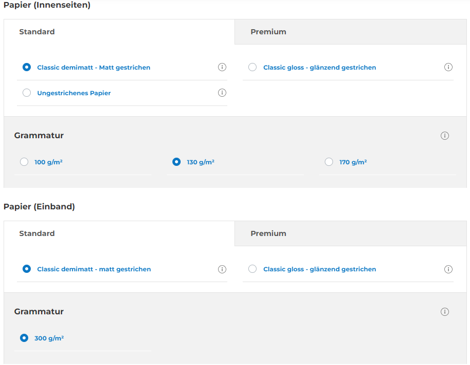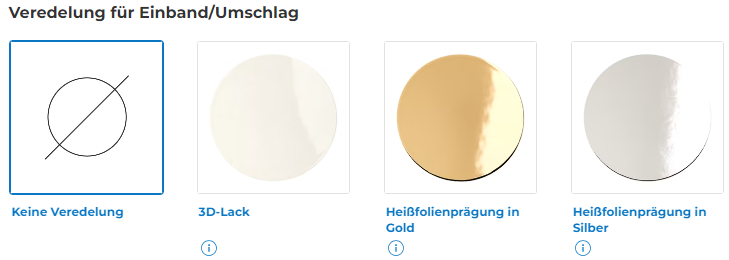 Möchten Sie Ihr Buch mit einem exklusiven Effekt auf dem Einband aufwerten? Fügen Sie eine Veredelung auf der Außenseite Ihres Buches hinzu, der sowohl für das Soft- als auch für das Hardcover erhältlich ist. Diese Option ist ideal, um Ihrem Buch ein einzigartiges Aussehen zu verleihen! Bitte beachten Sie, dass die Veredelung nur für gestrichene Papiere möglich ist. Für einen besonderen Look können Sie auch ein strukturiertes oder spezielles Papier wählen, indem Sie verschiedene Materialien kombinieren. |