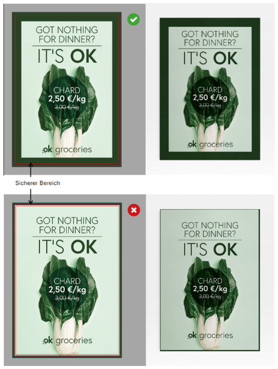 Wenn Ihre Datei Rahmen oder dekorative Elemente entlang des Randes enthält, stellen Sie sicher, dass Sie diese immer innerhalb des sicheren Bereichs platzieren, der im Template angegeben ist. Während der Schneidephase des gedruckten Produkts ist es normal, dass es Mikroversetzungen von 1-2 mm beim Schnitt selbst gibt. Daher ist es wichtig, alle Rahmen (sowie wichtige Texte und Grafiken) innerhalb des sicheren Bereichs zu platzieren, um sicherzustellen, dass sie nicht abgeschnitten oder fehlpositioniert auf dem fertigen Produkt erscheinen, was unerwünschte ästhetische Ergebnisse verhindert.