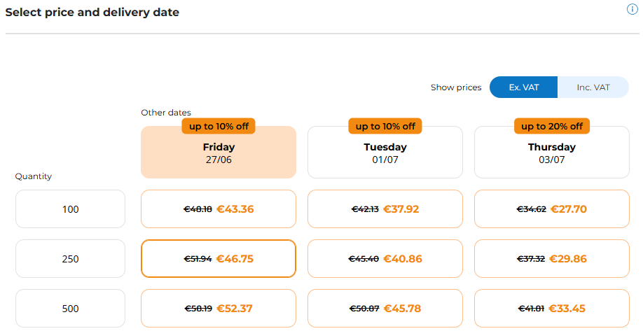 If there is an ongoing promo, you find the discounted quote automatically displayed on the website: the discounted price, quantity or delivery option, are highlighted in orange on the "price and delivery date" table; you have visibility both on the original and discounted price.