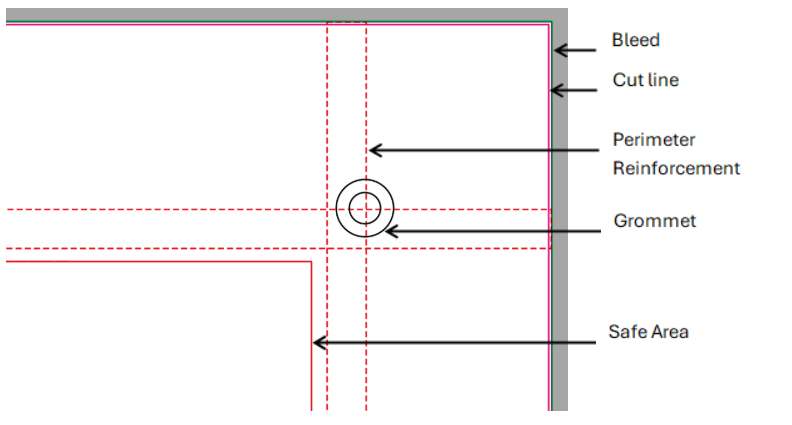 If you have ordered a banner or flag with accessories (eyelets, cords, or tensioners) or with specific finishes (perimeter reinforcement or sleeves), it is very important to place all relevant text and graphics only within the safe area. This ensures they are not cut off or positioned too close to the edges, thus avoiding undesirable aesthetic results.