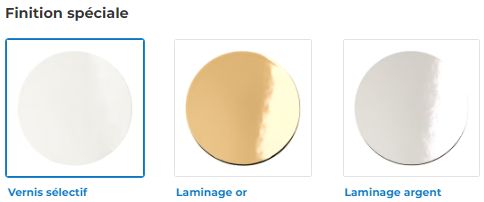 Sorprende a tu público con un efecto especial: ¡añade un acabado exclusivo a tus pegatinas! Elige entre laminado dorado, plateado o barniz sectorizado y haz que tu gráfica sea más atractiva. Ten en cuenta que esta opción solamente está disponible para algunos materiales. |