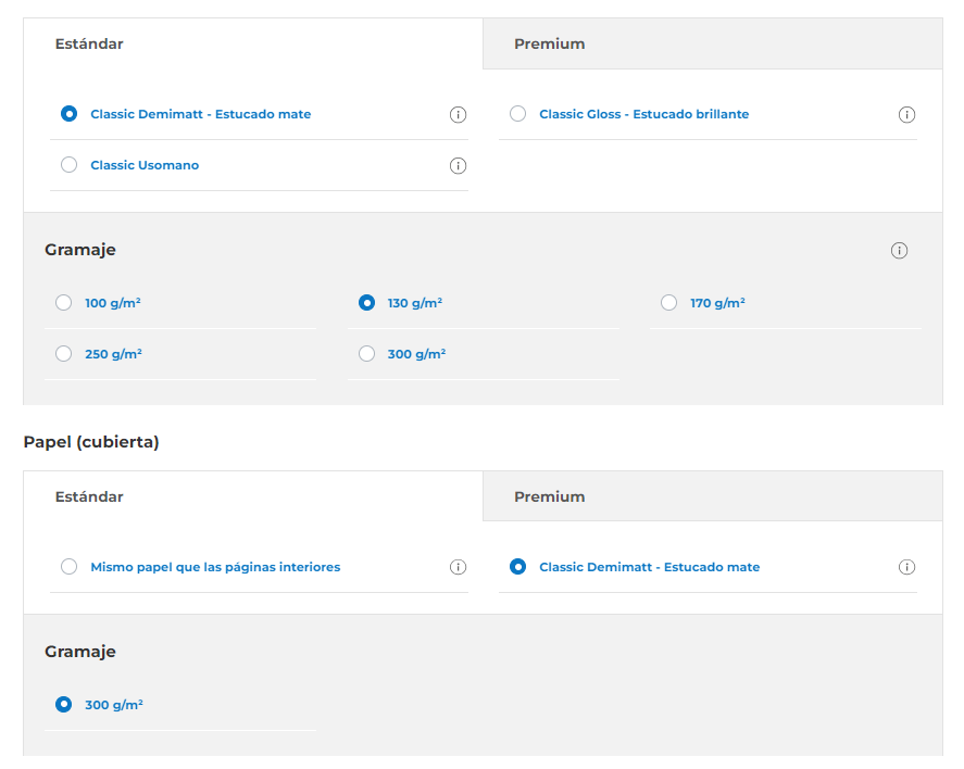 Recuerda elegir sólo papeles no estucados y lisos si piensas tomar notas en tu producto impreso. Para sumergirte en el mundo de nuestros papeles, lee este artículo. Si lo que buscas es una encuadernación más tradicional y quieres que tu publicación sea un auténtico libro, te recomendamos la encuadernación fresada o la encuadernación cosida para una edición premium y elegante. La encuadernación grapada, por su parte, es una alternativa viable para contenidos más breves tipo revista. |