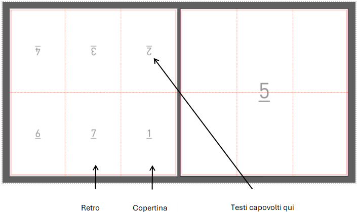 Il template contiene alcuni numeri che indicano l’ordine di lettura del pieghevole e ti aiutano a identificare immediatamente la copertina (numero 1) e il retro (l’ultimo numero). Questi numeri sono orientati nel senso di lettura della pagina, così saprai subito se ruotare i tuoi testi di 180°.