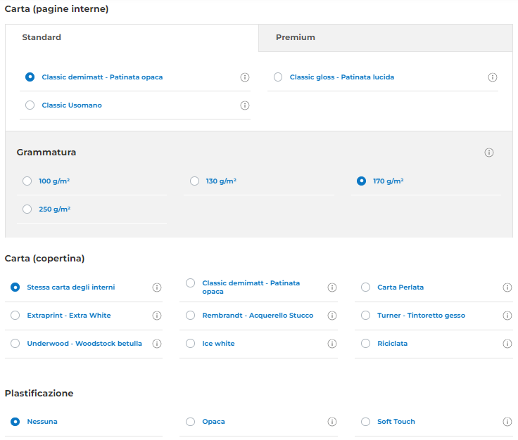 Offriamo la possibilità di stampare la copertina e le pagine interne con carte e grammature diverse. Puoi anche decidere di stamparle con la stessa carta e grammatura; spesso però si preferisce per la copertina una grammatura più alta con, inoltre, l’aggiunta di una plastificazione. Solitamente, consigliamo la plastificazione per proteggere la stampa da graffi e liquidi. La plastificazione dona anche un tocco di eleganza alla tua pubblicazione, risaltandone i colori e conferendogli un aspetto più raffinato. |