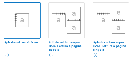 Non è possibile scegliere le dimensioni della spirale (diametro), che viene realizzata automaticamente a seconda della dimensione del dorso del prodotto stampato. Puoi comunque scegliere se avere la spirale nera o argento.