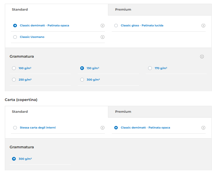 Approfitta della flessibilità di questo prodotto per stampare la copertina e le pagine interne su carte e grammature diverse oppure mantieni una coerenza scegliendo la stessa per tutto il libro. In molti preferiscono utilizzare una grammatura più alta per la copertina con, inoltre, l’aggiunta di una plastificazione, che consigliamo sulle carte patinate per proteggere la stampa da graffi e liquidi. La plastificazione dona inoltre un tocco di eleganza alla tua pubblicazione, migliorandone i colori e conferendogli un aspetto raffinato. |