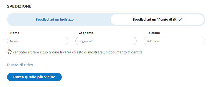 - Una volta aggiunti i prodotti al carrello, nella sezione "Spedizione" scegli "Spedisci ad un "Punto di ritiro"