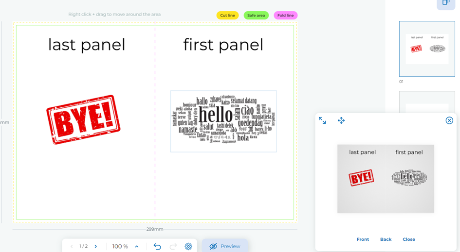 O nosso Designer é a forma mais fácil de criar os seus gráficos prontos a imprimir: paginando online, será fácil compreender a ordem de leitura, as faces e a orientação. Através da pré-visualização em 3D, poderá ver o folheto, aberto e fechado e evitar quaisquer erros de paginação. Encontre aqui mais informações sobre como utilizar a nossa ferramenta gratuita de criação de ficheiros. Caso contrário, poderá utilizar as instruções fornecidas na página do produto, onde se encontra uma explicação detalhada da disposição e orientação de cada tipo de dobra. Os lados estão numerados para o ajudar a compreender como é feita a dobra e qual a sentido de leitura. A frente e o verso do folheto dobrado são destacados. As mesmas indicações são também dadas no template diponibilizado (leia aqui como descarregar e utilizar).